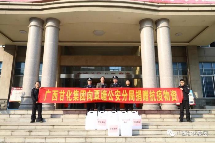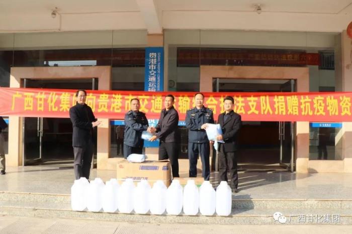 2021年1月18日、19日,廣西甘化集團(tuán)有限公司疫情防控物資捐贈儀式分別在貴港市交通運(yùn)輸綜合執(zhí)法支隊(duì)和貴港市覃塘公安分局辦公大樓前舉行,執(zhí)法支隊(duì)姚厚才支隊(duì)長、陳剛副支隊(duì)長,覃塘區(qū)公安分局吳顯臣副局長,甘化集團(tuán)副總裁黃敏昭、貴港甘化股份有限公司副總經(jīng)理劉曉東、人事總監(jiān)甘春鋒出席捐贈儀式。