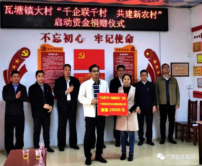 2021年3月11日下午,在貴港市應急管理局組織的“千企聯(lián)千村,共建新農(nóng)村”啟動資金捐贈儀式上,廣西貴港市甘化酒精有限公司積極響應號召,由總經(jīng)理覃志強先生代表公司捐贈現(xiàn)金2萬元,為支持改造鄉(xiāng)村風貌貢獻力量。