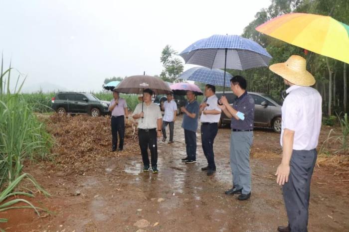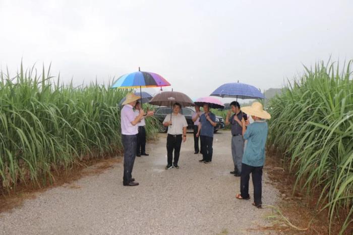韋理事長(zhǎng)一行不顧行車旅途勞頓,先是直達(dá)貴港甘化樟木顯滕基地,冒雨實(shí)地了解相同甘蔗品種在同一地塊采用粉壟技術(shù)和非粉壟技術(shù)種植的生長(zhǎng)情況;途中還到蒙公鎮(zhèn)凌寺村大青屯察看采用寬窄行技術(shù)種植的甘蔗生長(zhǎng)情況。