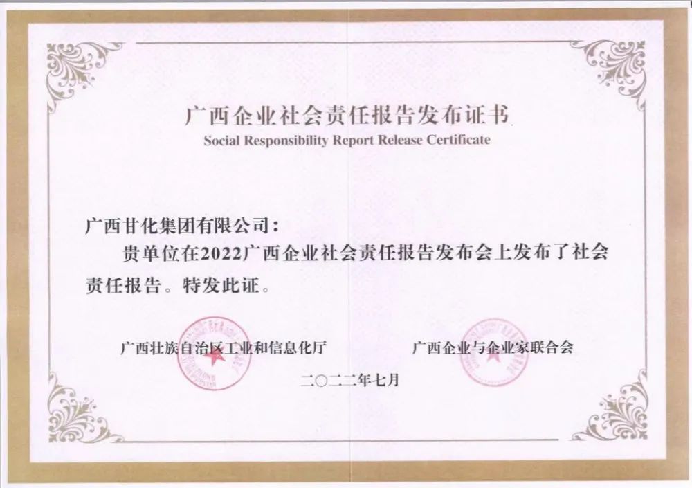 2022年7月13日,自治區(qū)工業(yè)與信息化廳和廣西企業(yè)與企業(yè)家聯(lián)合會(huì)在廣西南寧聯(lián)合舉辦“2022廣西企業(yè)社會(huì)責(zé)任報(bào)告發(fā)布會(huì)”,甘化集團(tuán)在此次會(huì)議上獲頒廣西企業(yè)社會(huì)責(zé)任報(bào)告發(fā)布證書(shū)。