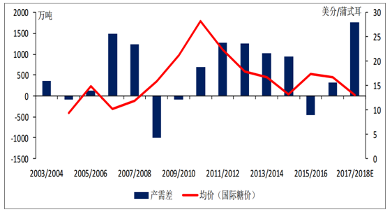 國際糖價與全球產(chǎn)需差成顯著負相關(guān)關(guān)系,具體表現(xiàn)為:全球產(chǎn)需趨緊或者出現(xiàn)缺口,國際糖價上漲;產(chǎn)需過剩,國際糖價下跌。全球糖價漲跌通過進口傳導至國內(nèi),從而引發(fā)內(nèi)糖價格變動。