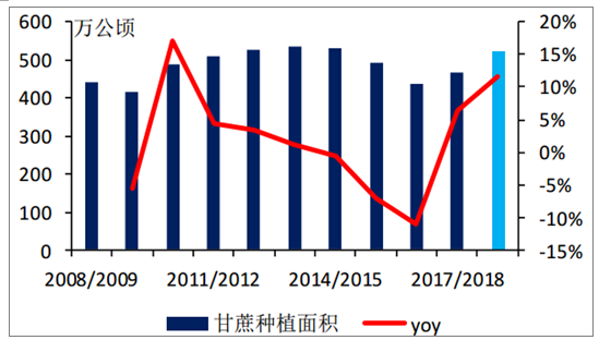 我國甘蔗主產(chǎn)區(qū)廣西實施甘蔗最低收購價政策,每年開榨前制定當年甘蔗收購價。2017/2018榨季廣西甘蔗收購價由475元/噸提高至500元/噸,種植面積進一步增加。此外,從歷史上來看,我國糖產(chǎn)量仍處于三年增產(chǎn)周期,預(yù)計國內(nèi)糖2018/2019榨季供應(yīng)增加。