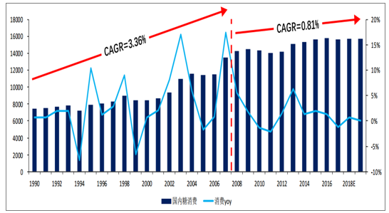 自1990年以來,我國白糖消費經(jīng)歷了快速發(fā)展期與穩(wěn)定期兩個階段:1990-2007年間白糖消費受到經(jīng)濟發(fā)展與人口增長的拉動快速提升,由1990年745.1萬噸增長到1350萬噸,增長81.18%,年復合增長達到3.36%;2008年后由于經(jīng)濟發(fā)展疲軟等原因,白糖消費穩(wěn)定在1400-1600萬噸左右。