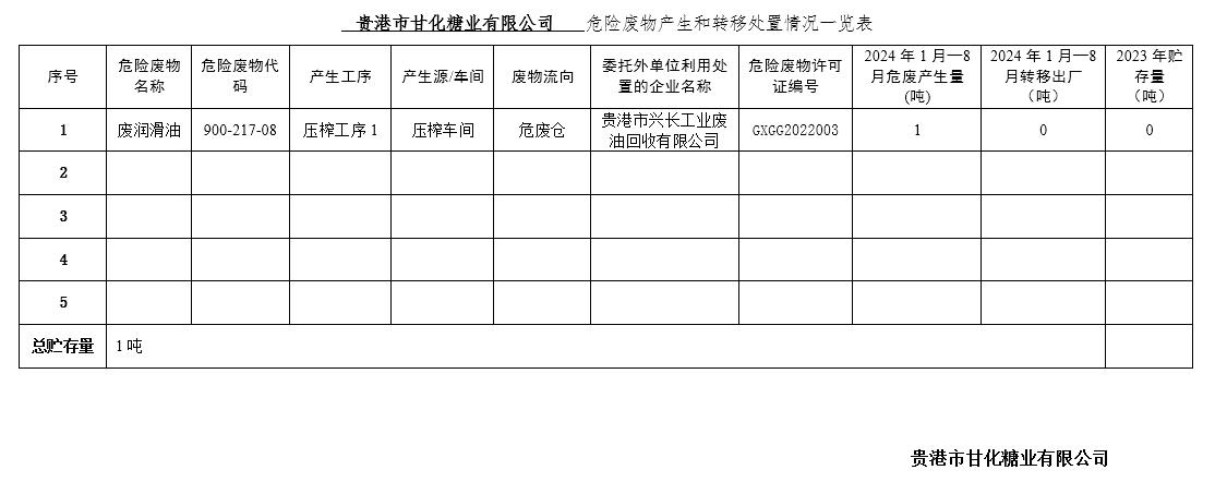我公司共產(chǎn)生1種危險(xiǎn)廢物,2023年危廢貯存量 共0噸,2024年1月至8月產(chǎn)生危廢共1噸,轉(zhuǎn)移處置0噸,所有危廢均轉(zhuǎn)移到符合國家資質(zhì)的處置單位,具體轉(zhuǎn)移處置種類和數(shù)量信息如下表所示: